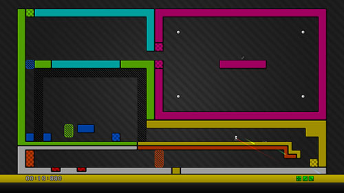 Most levels have colored checkerboards, platforms, walls, and grates. By touching a colored checkerboard, your ninja will change to that color, which is also indicated by the border along the bottom of the screen as well as the color of your grapple rope. By changing colors, you are free to touch the walls and platforms of the corresponding color, and you can pass freely through same-colored grates. Touch any other color – besides white – and you die instantly.